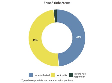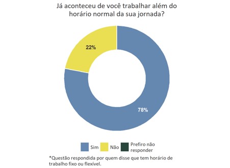 Dois terços dos trabalhadores que têm experiência com teletrabalho trabalhavam ou trabalham por hora e um terço, por produtividade. Entre os que trabalham por jornada, 61% dizem receber mensagens, ligações ou e-mails fora do horário regular de trabalho. Além disso, 78% afirmam já ter trabalhado além do horário normal da jornada.