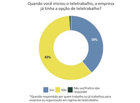 No entanto, mais da metade (60%) dos trabalhadores que estão ou já estiveram em trabalho remoto indica que, quando iniciou o teletrabalho, a empresa ou organização empregadora não tinha essa modalidade de trabalho implantada.