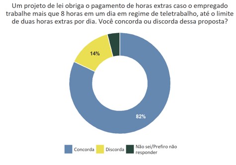 A pesquisa também avaliou a opinião dos brasileiros sobre o Projeto de Lei 3.512∕20, de autoria do senador Fabiano Contarato (Rede-ES). A maioria dos brasileiros (82%) concorda com o pagamento de horas extras caso a jornada de teletrabalho seja superior a oito horas diárias.