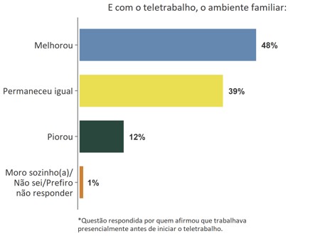Segundo os resultados, o teletrabalho também trouxe benefícios para a vida pessoal. A maioria dos trabalhadores remotos percebe aumento no nível de bem-estar pessoal (49%) e melhoria no ambiente familiar (48%).