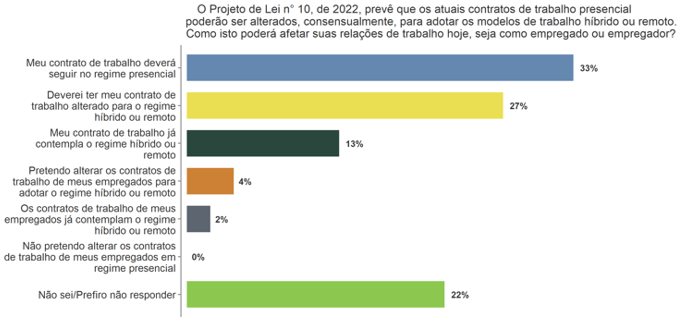 Caso o projeto de lei seja aprovado, 33% dos respondentes acreditam que seus contratos de trabalho permanecerão no regime presencial. Por outro lado, 27% avaliam que seus contratos serão alterados para o regime híbrido ou remoto.