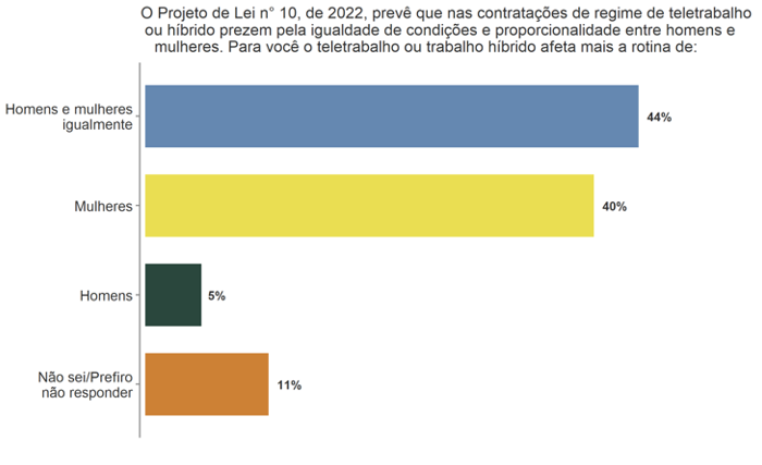 Em relação à alteração da rotina, 44% dos respondentes acreditam que homens e mulheres serão igualmente afetados pela adoção do regime de trabalho remoto ou híbrido e 40% acreditam que as mulheres serão as mais afetadas.