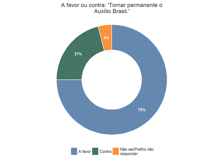 A pesquisa mostra que a ampla maioria dos brasileiros, 75%, é favorável a tornar permanente o programa de transferência de renda, o Auxílio Brasil, enquanto apenas 21% dos brasileiros se mostram contrários.