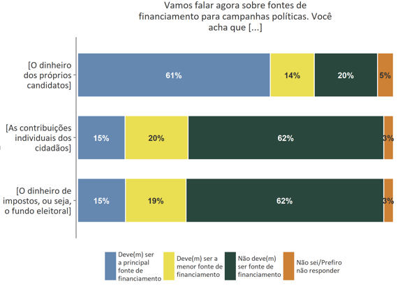 Por conseguinte, a pesquisa mostra que, para 61% dos brasileiros, a principal fonte de financiamento para campanhas políticas deve ser o dinheiro dos próprios candidatos.