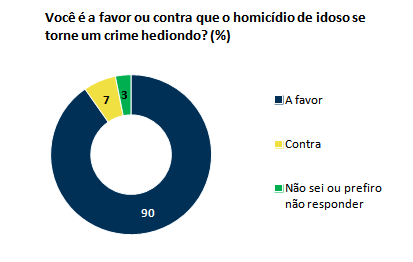 Os participantes opinaram ainda sobre um projeto de lei em tramitação no Congresso Nacional que converte o homicídio de idoso em crime hediondo (PLS 373/2015), ou seja, impõe punição mais severa para quem praticar esse tipo de crime. A maioria se posicionou a favor ao projeto. Mais de dois terços também acreditam que essa alteração ajudaria a diminuir a violência contra o idoso no Brasil.