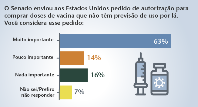 Data Senado > Resultados Publicações por Ano: 2021 16/07/2021 CPI é muito importante para o país, segundo 66% dos brasileiros que acompanham os trabalhos da comissão O Instituto DataSenado realizou pesquisa para avaliar a opinião dos brasileiros sobre a CPI da Covid-19, em funcionamento no Senado Federal, e a vacina contra o coronavírus. Temas: Destaque Todas Covid-19 07/07/2021 Respondentes discordam da criação de passaporte sanitário O Instituto DataSenado realizou enquete online para avaliar a opinião de internautas sobre o PL 1.674/2021, que cria o Passaporte de Imunização e Segurança Sanitária (PSS) Temas: Destaque Todas Saúde Covid-19 11/06/2021 Participantes rejeitam projeto que proíbe processos de privatização durante a pandemia Enquete online realizada em maio abordou proposta de lei que impede processos de desestatização e desinvestimento público enquanto durar o combate à pandemia. Temas: Todas Covid-19 18/05/2021 92% dos brasileiros acham que quem divulgar notícias falsas sobre a vacina contra o coronavírus deve ser punido Instituto DataSenado realizou pesquisa nacional para avaliar a opinião dos brasileiros sobre a vacina contra o coronavírus e a CPI da Covid-19, em funcionamento no Senado Federal. Temas: Destaque Todas Covid-19 Fake news Notícias falsas 12/05/2021 Participantes apoiam aumento de pena para furto e roubo de imunizante contra coronavírus O Instituto DataSenado realizou enquete online para avaliar a opinião de internautas sobre o PL 1.004/2021, que aumenta as penas para crimes de furto e roubo relacionados a doses de vacina contra a Covid-19. Temas: Destaque Covid-19 Todas legislação saúde 09/04/2021 Todos os respondentes concordam que fraudar a aplicação de vacinas e medicamentos deve ser crime O DataSenado realizou enquete online para avaliar a opinião de internautas sobre projeto de lei que criminaliza fraudes na aplicação de vacinas e medicamentos. Temas: Destaque Todas Saúde Covid-19 05/04/2021 Brasileiros apoiam iniciativas do Senado no combate à pandemia Tendo em vista o início da imunização da população brasileira contra a Covid-19, o Instituto DataSenado realizou pesquisa para conhecer a opinião dos brasileiros sobre propostas de lei apresentadas no Congresso Nacional com o objetivo de apoiar e zelar pelo processo de vacinação no país. Temas: Destaque Todas Saúde Covid-19 29/03/2021 Para brasileiros, vacinação vai ser mais rápida com a possibilidade de estados, municípios e empresas comprarem vacinas O Instituto DataSenado realizou pesquisa para avaliar a opinião dos brasileiros sobre a compra de vacinas por estados, municípios e empresas e outras medidas para conter a disseminação do coronavírus. Temas: Destaque Todas Covid-19 « 1 2 3 »