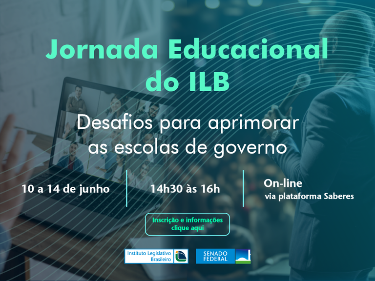 O Instituto Legislativo Brasileiro, escola de governo do Senado Federal, convida aos servidores da Casa Legislativa, especialmente alunos e professores do ILB, bem como de câmaras de vereadores e de assembleias legislativas parceiras para a Jornada Educacional do ILB - Desafios para aprimorar as escolas de governo.