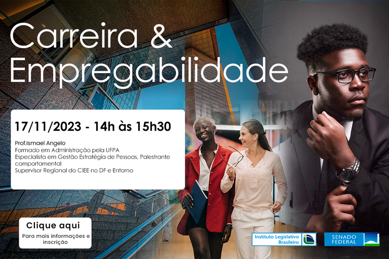 Esta ação educacional buscará sensibilizar a respeito desse contexto de ingresso no mercado de trabalho, trazendo dicas e orientações, especialmente para os futuros profissionais que estão fazendo do Senado Federal e de órgãos parceiros verdadeiros laboratórios de aprendizagens. Dessa forma, a palestra é voltada para os estagiários e os menores aprendizes que buscam aprimorar seus conhecimentos acerca das melhores estratégias para desenvolvimento de suas carreiras.