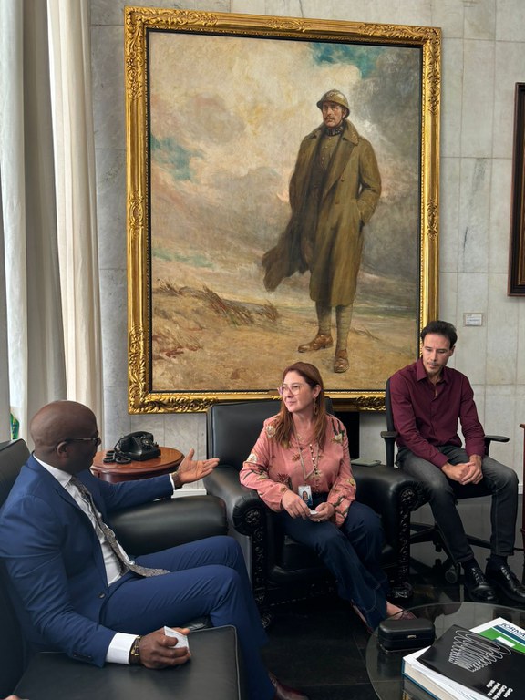 A coordenada do Museu do Senado, Cristina Monteiro, acompanhada pelo diretor de gabinete de Gestão Documental e Biblioteca da Presidência da República e também chefe da delegação de Angola, Rogério Félix Paulo Cambuinda, e o chefe do Serviço de Atendimento e Gestão de Espaços Culturais ( Seagec), Rodrigo Caiado