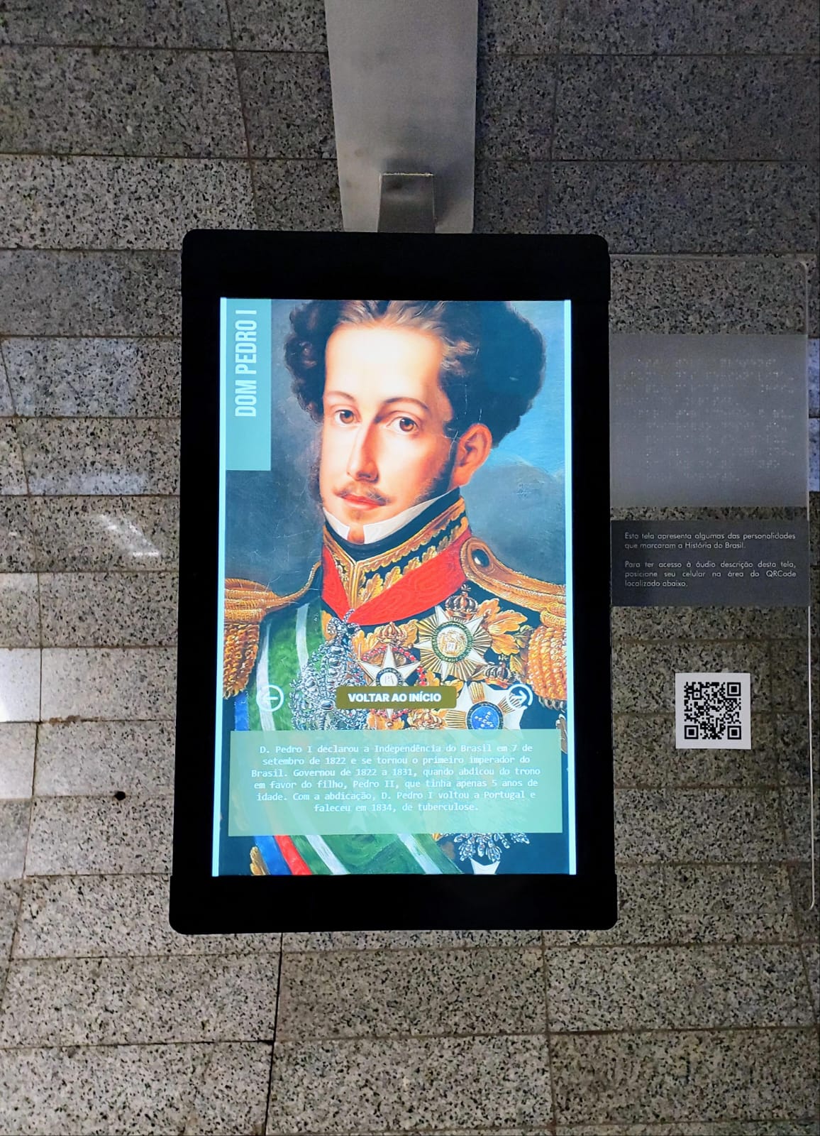 Na imagem esta presente um tablete, com um conteúdo interativo com a foto de D. Pedro I. O tablete está preso num suporte de acrílico, com um QRCODE do lado.