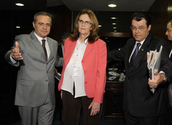 Presidente do Senado, Renan Calheiros (PMDB-AL) e o líder do Governo, senador Eduardo Braga (PMDB-AM) conduzem presidente da Petrobras, Graça Foster, convidada a falar na CAE sobre a refinaria de Pasadena (EUA). Foto: Jane Araújo