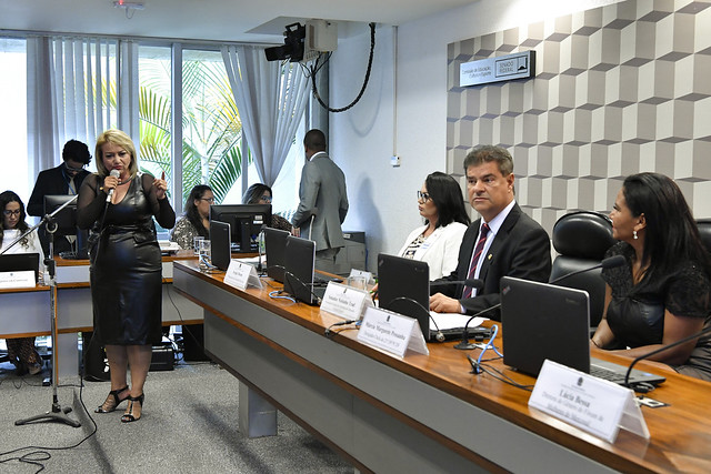 Comissão de Educação, Cultura e Esporte (CE) realiza audiência pública interativa destinada "a debater a importância da educação para a mudança de mentalidades e o fortalecimento das políticas para as mulheres". Em pronunciamento, diretora de Gênero do Fórum de Mulheres do Mercosul e integrante do "Projeto Caminho das Flores", Lúcia Bessa. Participam:procuradora da Fazenda Nacional (PRFN da 1ª Região - DF) e integrante do "Projeto Caminho das Flores", Neydja Morais;presidente eventual da CE, senador Nelsinho Trad (PSD-MS);delegada-Chefe da 23ª Delegacia de Polícia da Ceilândia e integrante do "Projeto Caminho das Flores", Márcia Margarete Pessanha. Foto: Geraldo Magela/Agência Senado