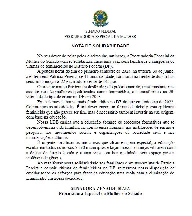No seu dever de zelar pelos direitos das mulheres, a Procuradoria Especial da Mulher do Senado vem se solidarizar, mais uma vez, com familiares e amigos/as de vítimas de feminicídios no Distrito Federal (DF).