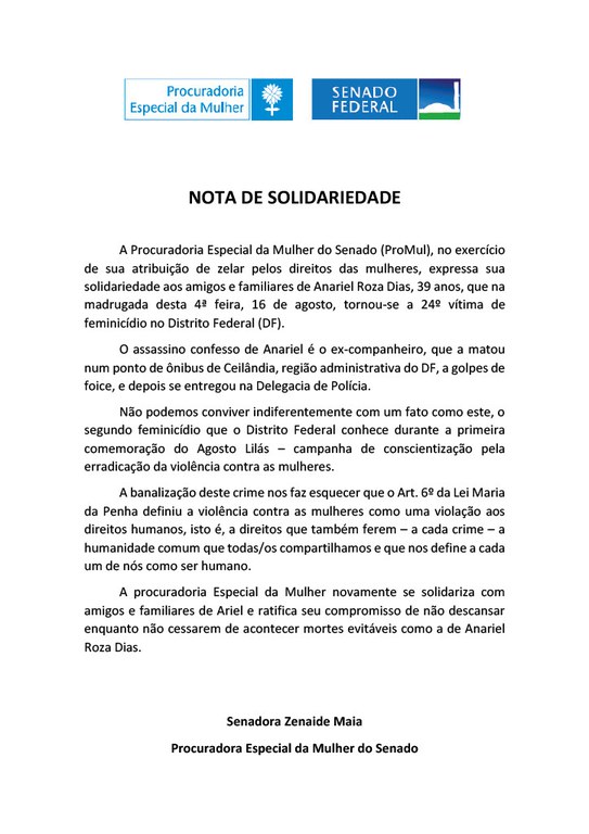 A Procuradoria Especial da Mulher do Senado (ProMul), no exercício de sua atribuição de zelar pelos direitos das mulheres, expressa sua solidariedade aos amigos e familiares de Anariel Roza Dias, 39 anos, que na madrugada desta 4ª feira, 16 de agosto, tornou-se a 24º vítima de feminicídio no Distrito Federal (DF).