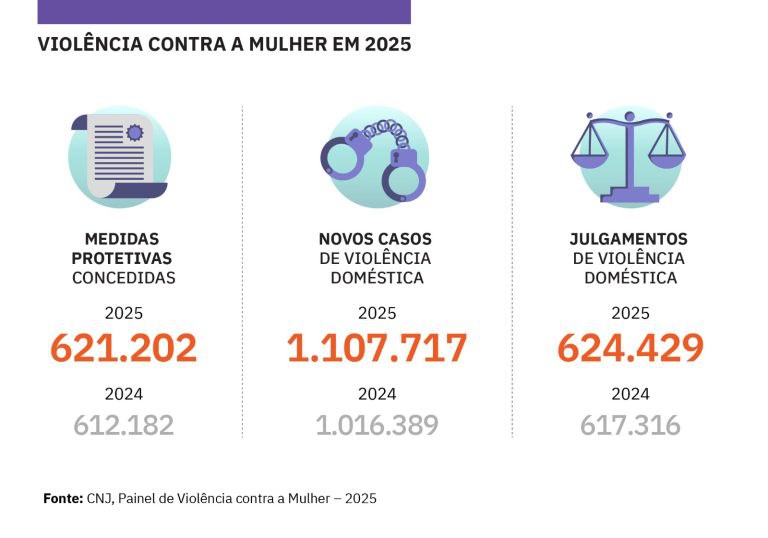 Apenas em 2025, o Poder Judiciário recebeu mais de 1 milhão de novos casos de violência doméstica, incluindo crimes previstos na Lei Maria da Penha (que completa 20 anos em 2026) e descumprimento de medidas protetivas.