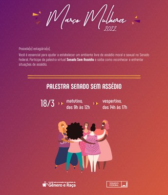 As(os) estagiárias(os) do Senado Federal que têm interesse em saber como reconhecer e enfrentar situações constrangedoras, poderão participar da palestra virtual Senado Sem Assédio e ajudar a estabelecer um ambiente livre de assédio moral e sexual no ambiente profissional.