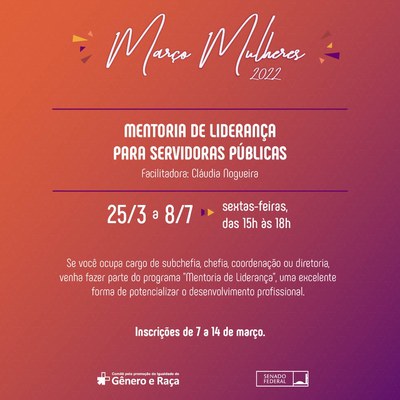 Abertas as inscrições para o Curso de Mentoria de Liderança, ministrado por Cláudia Nogueira, da Coordenação de Capacitação, Treinamento e Ensino (Cotren). A experiência tem como público-alvo servidoras que ocupem cargo de chefia do Senado Federal.