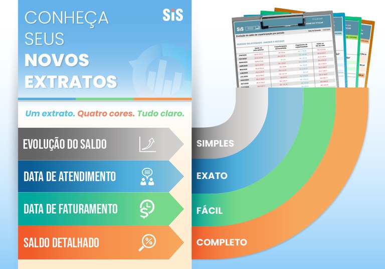 Ela explica que as mesmas informações agora são apresentadas em quatro documentos distintos: o extrato mensal detalhado (laranja), o extrato organizado por data de uso da carteira (azul), o extrato organizado por data em que a despesa entrou no saldo devedor do titular (verde) e o extrato mais simples, que aponta a evolução do saldo devedor gerado por coparticipação (cinza).
