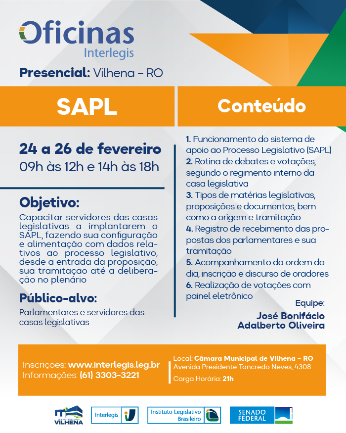 Oficina de SAPL - PRESENCIAL em Câmara Municipal de Vilhena - (RO) - 03/2026
