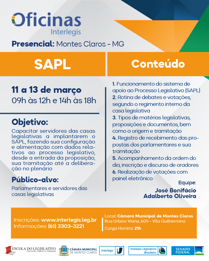 Oficina de SAPL - PRESENCIAL em Câmara Municipal de Montes Claros (MG) - 04/2026