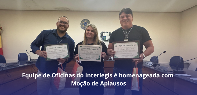 A equipe do Interlegis/ILB foi homenageada com uma Moção de Aplausos pela Câmara Municipal de Sabará (MG) em reconhecimento ao trabalho realizado em junho na Oficina de Revisão da Lei Orgânica e do Regimento Interno, conduzida pelos servidores Ricardo Murta, André Luiz e Bruna Brasil.