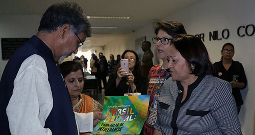 Em 2014, quando ganhou o prêmio Nobel, Kailash Satyarthi concedeu entrevista à TV Senado. Agora, em 2017, Satiarthi volta ao Senado para falar sobre a Campanha Global contra o Trabalho Infantil e de Combate à Exclusão Escolar “100 Milhões por 100 Milhões”. Após audiência pública realizada pela Comissão de Educação, a equipe do Jovem Senador apresentou o projeto a Satyarthi e esposa destacando a iniciativa como uma forma de aproximar os jovens estudantes do processo legislativo brasileiro.