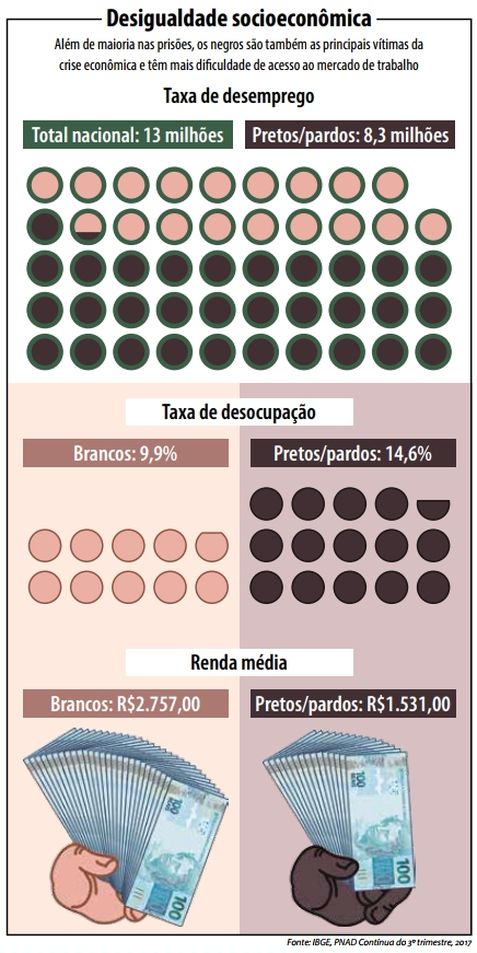 Na sexta-feira, o Ministério da Justiça divulgou o Levantamento Nacional de Informações Penitenciárias (Infopen) segundo o qual, em junho de 2016, 64% da população carcerária eram negros (pretos e pardos), na maioria jovens. De acordo com o levantamento, o Brasil possui hoje 726 mil presos e é o terceiro país em número de pessoas encarceradas, atrás apenas dos Estados Unidos e da China.