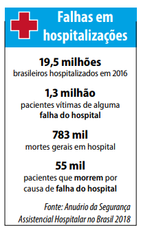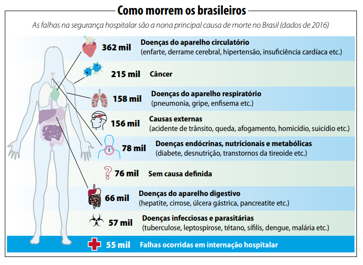 Em 2016, de acordo com o estudo da UFMG e do Iess, 55 mil brasileiros morreram em decorrência de falhas nos hospitais, como infecções evitáveis e a administração de medicamentos errados. Houve, em média, uma morte a cada dez minutos. É como se, ao cabo de dez anos, morresse a população inteira de uma cidade do porte de Juiz de Fora (MG) ou Londrina (PR).
