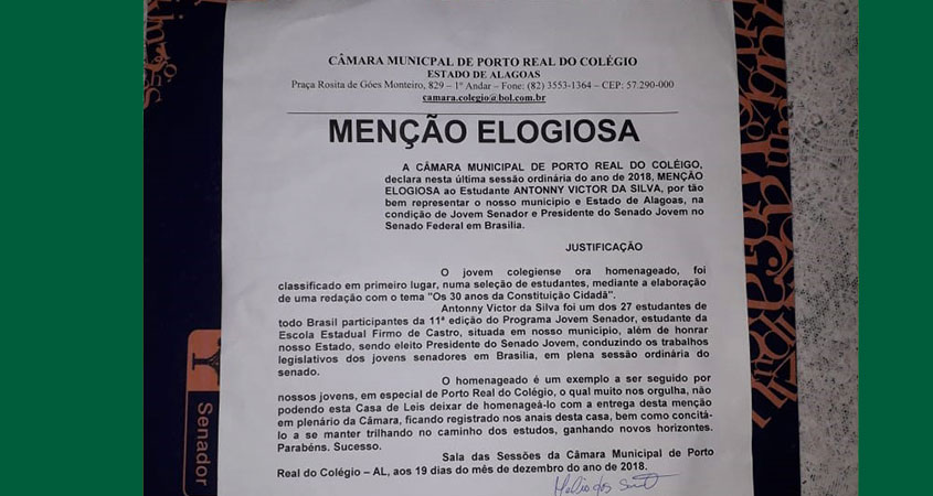 Pelo Estado de Alagoas, o Jovem Senador Antonny Victor da Silva recebeu uma Menção Elogiosa da Câmara Municipal de Porto Real do Colégio (AL), em 19.12.2018, por bem representar sua cidade e o Estado de Alagoas, especialmente na qualidade de Presidente da Mesa Jovem de 2018.