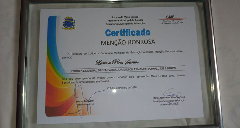 A Jovem Senadora do Mato Grosso Larissa Pires Santos e sua professora orientadora Cintia Zocolotto foram homenageadas pela Prefeitura e pela Secretaria de Educação da cidade de Cólíder (MT), no dia 03 de dezembro de 2018.