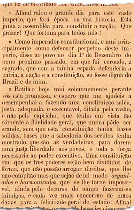— Afinal raiou o grande dia para este vasto Império, que fará época na sua história. Está junta a Assembleia para constituir a nação. Que prazer! Que fortuna para todos nós! — discursou ele, acomodado num trono.