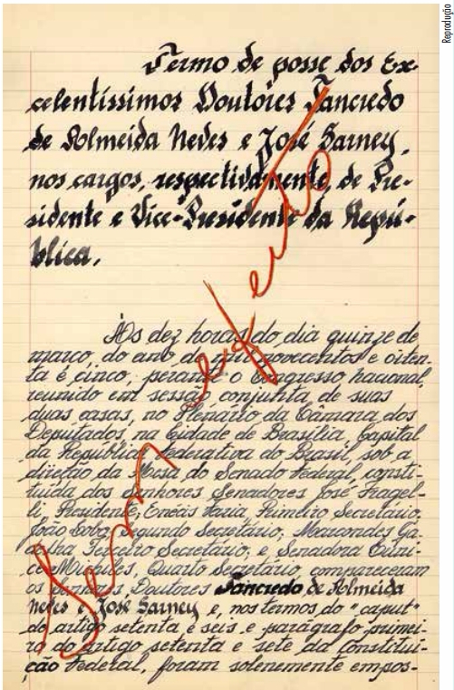 O termo de posse de Tancredo, que fora escrito dias antes e precisou ser anulado