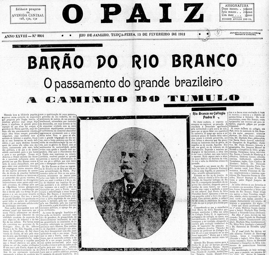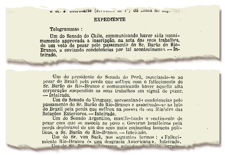 De acordo com documentos do Arquivo do Senado, o senador Quintino Bocayuva (RJ) fez um discurso em maio de 1912 homenageando o recém-finado ministro das Relações Exteriores: