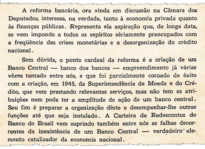 — Existem pelo mundo numerosos bancos centrais que, além das atividades monetárias que lhes são próprias, praticam operações bancárias comuns sem que se tenha notícia de perturbações no seu funcionamento. É que eles, como acontece com o Banco Central da Austrália, separam as duas atividades em dois departamentos distintos. Não nos custará fazer o mesmo, criando no Banco do Brasil, como se tem sugerido, uma diretoria monetária e uma diretoria bancária.