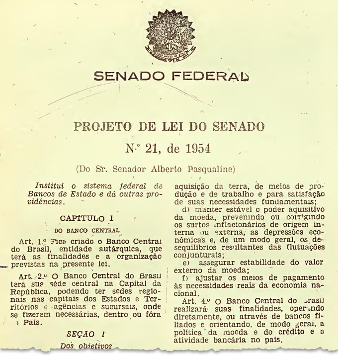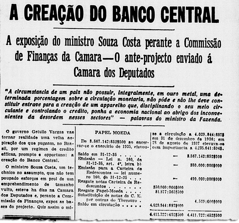Em 1937, o governo Getúlio Vargas submeteu à Câmara dos Deputados um projeto de criação do Banco Central, mas ele foi logo engavetado por causa do autogolpe que instaurou a ditadura do Estado Novo (1937-1945) e fechou o Congresso.