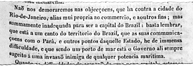 — O Brasil deve, em minha opinião, ser mais uma nação agrícola do que comercial. Ora, o desenvolvimento da agricultura em vasta escala não poderá conseguir-se senão promovendo-se a formação de grandes estabelecimentos no centro do Império. O meio mais óbvio que se antolha para realizá-los é a criação da capital nesse centro — argumentou.