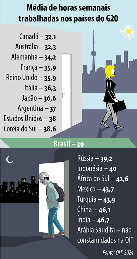 Além do maior tempo de descanso para o trabalhador e da expectativa de geração de empregos, outro argumento comum nas propostas é o descompasso do Brasil a relação a outros países que já adotaram carga horária menor. Entre as maiores economias do mundo (G20), o Brasil ocupa a 11ª colocação em relação às médias de horas trabalhadas por semana (veja quadro). A menor carga horária semanal é do Canadá, com 32 horas. No outro extremo está a Índia, com quase 47 horas. A média brasileira é de 39 horas, conforme dados da Organização Internacional do Trabalho (OIT) em 2024.