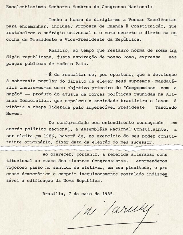 É provável que ele não tenha feito isso antes porque aguardava a recuperação e a posse de Tancredo Neves, a quem caberia cumprir a promessa de campanha de restabelecer o voto popular. Sarney remeteu a proposta ao Congresso em 7 de maio, 16 dias após a morte de Tancredo. Na ocasião, o presidente discursou: