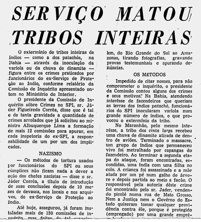 O jornal avaliou que as violências descritas no Relatório Figueiredo “só encontram paralelo na ação de extermínio em massa praticada pelo nazismo”. O Correio da Manhã seria fechado em 1974, sufocado financeiramente pela ditadura.