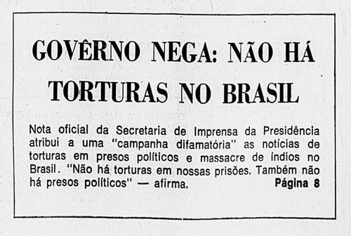 — Então pudemos perguntar, apontando aos jornalistas holandeses, se um ditador ou um país em ditadura, que tortura presos, trata os índios da maneira como aquelas fotos mostravam. O que a delegação brasileira fez foi um serviço inestimável de promoção do Brasil e do restabelecimento da verdade a respeito do nosso país.