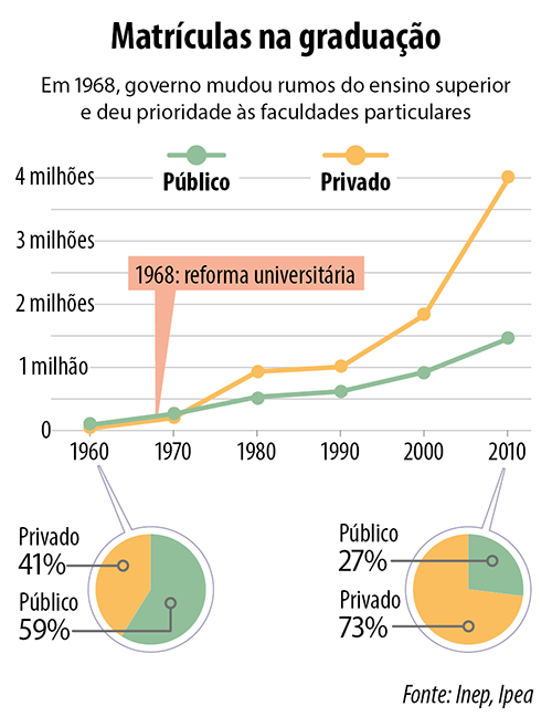 As instituições privadas respondem hoje pela grande maioria das matrículas no ensino superior (75% do total). Durante várias décadas, contudo, foram as instituições públicas que sustentaram o setor. Isso mudou no fim de 1968, quando a ditadura militar fez uma reforma universitária que, entre outras mudanças, deu o domínio do mercado à iniciativa privada.