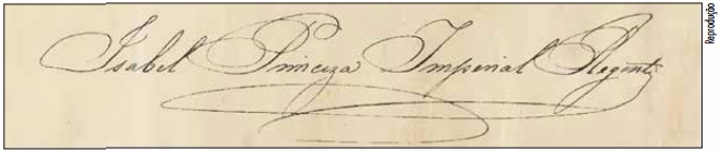 Na ausência de Pedro II, a fala do trono cabia à princesa Isabel: assinatura delicada contrasta com letra firme do pai e do avô