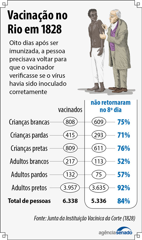 — As bexigas são um dos maiores flagelos que devastam a humanidade — afirmou também em 1826 o senador Antônio Gonçalves Gomide (MG). — Na minha província, foram tantas as mortes, que o arraial da Passagem ficou reduzido à metade. Isso não pode ser senão por desleixo, ao menos depois de haver um específico [a vacina] tão seguro.