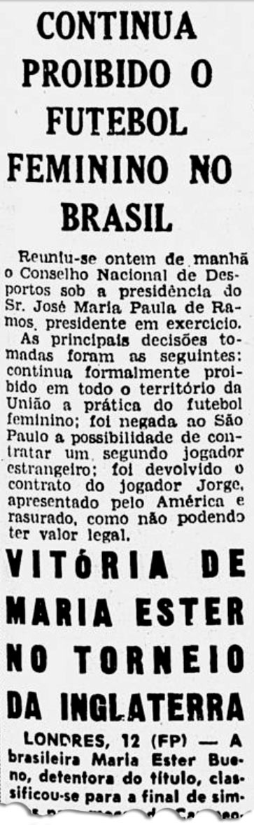 Na realidade, o decreto-lei de Vargas proibia de forma implícita as mulheres de jogar futebol. Isso ficava subentendido no artigo que falava genericamente das modalidades “incompatíveis com as condições de sua natureza”.
