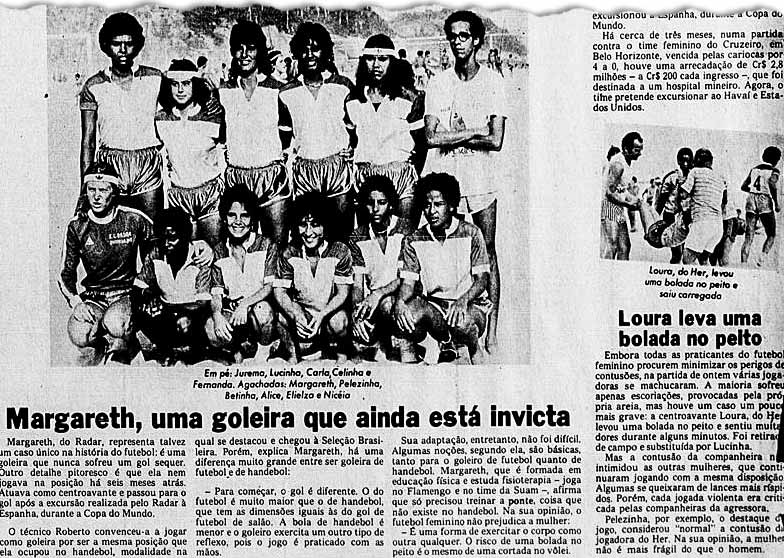 — É uma quantidade irrelevante. Atribuo isso ao futebol, porque é o nosso esporte nacional. Através do esporte se revelam, se projetam os campeões, os ídolos do povo que merecem imitação. Veem-se terrenos baldios transformados espontaneamente em campos, e eles são ocupados por quem? Por garotos, meninos. A pelada de adultos, também por homens. O clube de futebol, que em qualquer povoado não falta, é sempre só dos homens. A restrição [ao futebol] se reflete no ingresso da mulher no esporte [em geral], porque ela não tem a quem imitar.