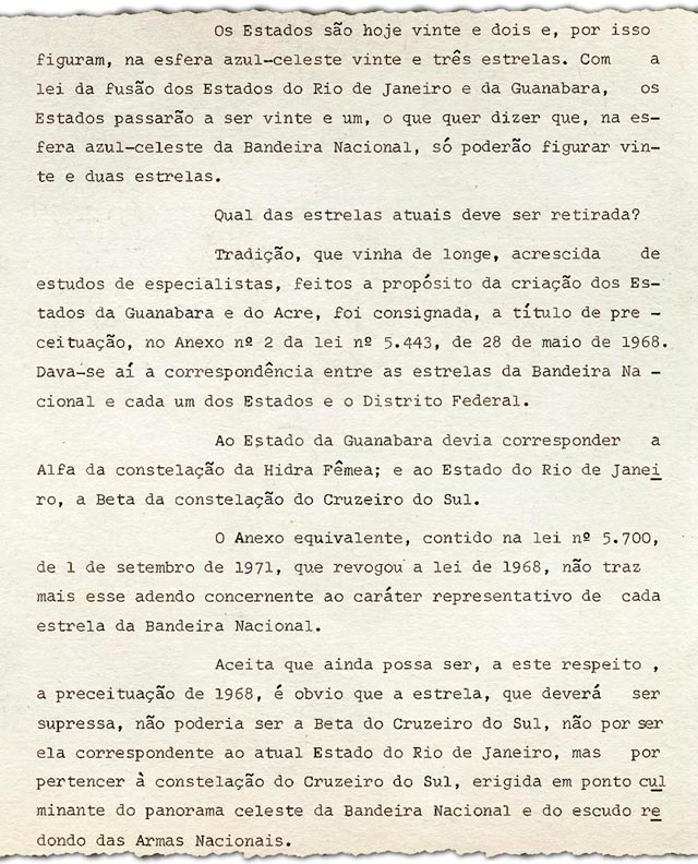 — Nessa anunciada fusão, o mais desfavorecido será o estado do Rio de Janeiro. Naturalmente que a imensa metrópole carioca absorverá a quase totalidade das atenções do governador do estado resultante. A pujante imprensa guanabarina não gritará decerto pelas necessidades de Magé, Cordeiro e Nova Friburgo [municípios fluminenses]. Continuará, isto sim, gritando pelos problemas de Copacabana, do Méier, de Madureira, do Grajaú e por aí afora. Será um estado macrocéfalo, aleijado, com a cabeça imensamente desproporcional ao corpo.