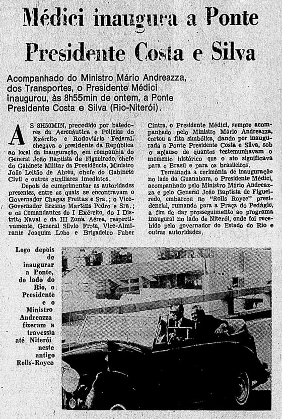 O senador fluminense Amaral Peixoto citou a inauguração da Ponte Rio-Niterói, realizada em 4 de março de 1974, exatos três meses antes de o governo remeter o projeto da fusão ao Congresso. A cerimônia foi conduzida pelo presidente Emílio Garrastazu Médici, em seus últimos dias de governo. Em carro aberto, o ditador partiu do Rio, onde cumprimentou o governador da Guanabara, e chegou a Niterói, onde saudou o governador do Rio de Janeiro. Amaral Peixoto disse: