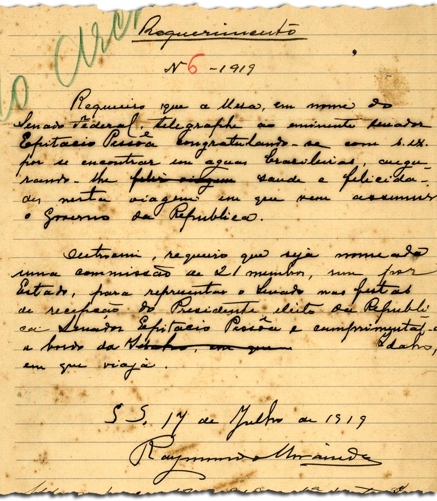 Hoje, em seu acervo histórico, o Arquivo do Senado guarda uma série de documentos de 1919 que ajudam a explicar como um candidato se elegeu presidente estando no outro lado do Atlântico e sem nem sequer mover uma palha. Entre esses documentos, estão discursos de parlamentares.