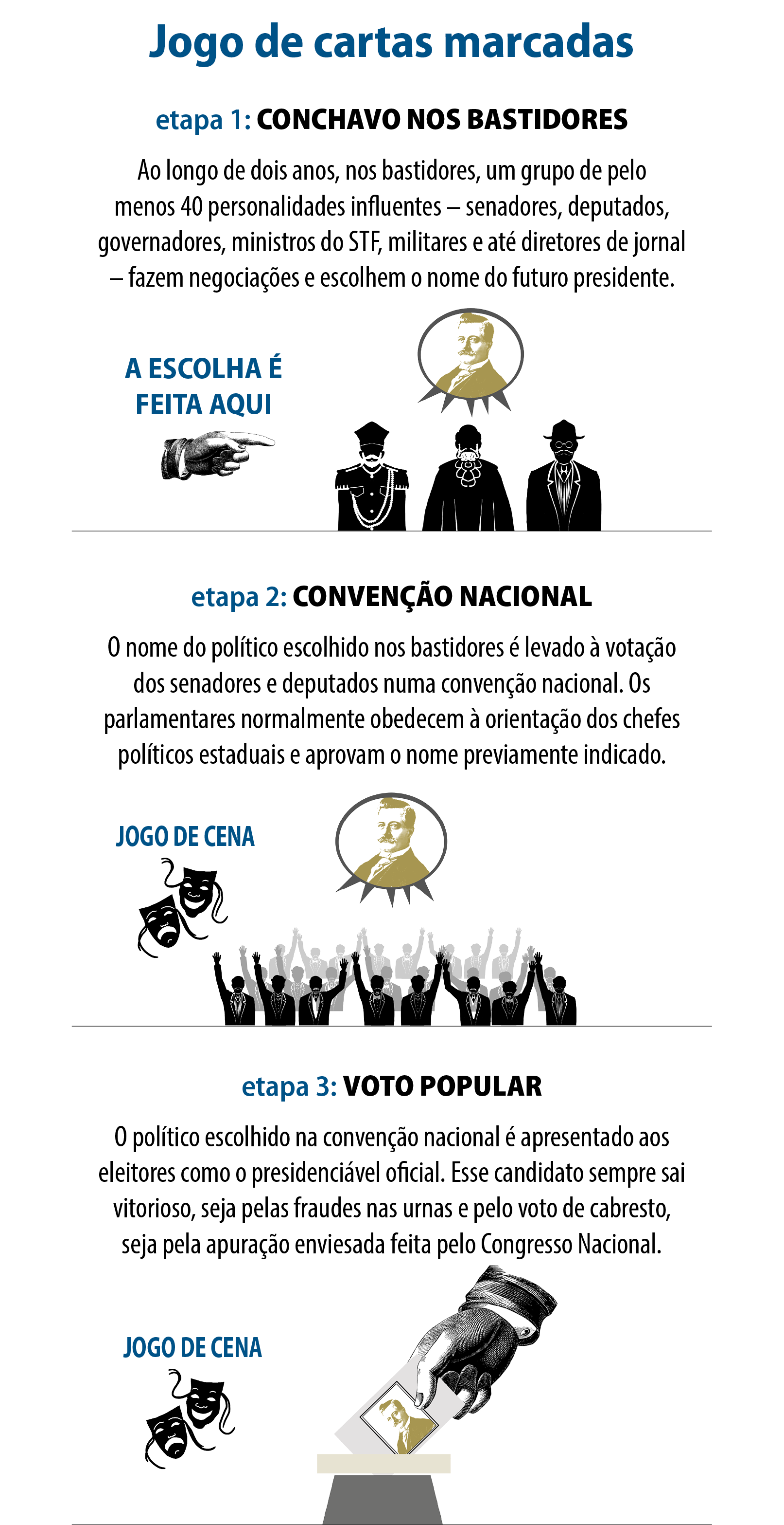 A escolha do presidente passava por três etapas. A primeira ocorria nos bastidores, onde os chefões políticos dos estados negociavam até chegarem a um nome de consenso. As negociações eram tão complicadas que podiam se estender por até dois anos.