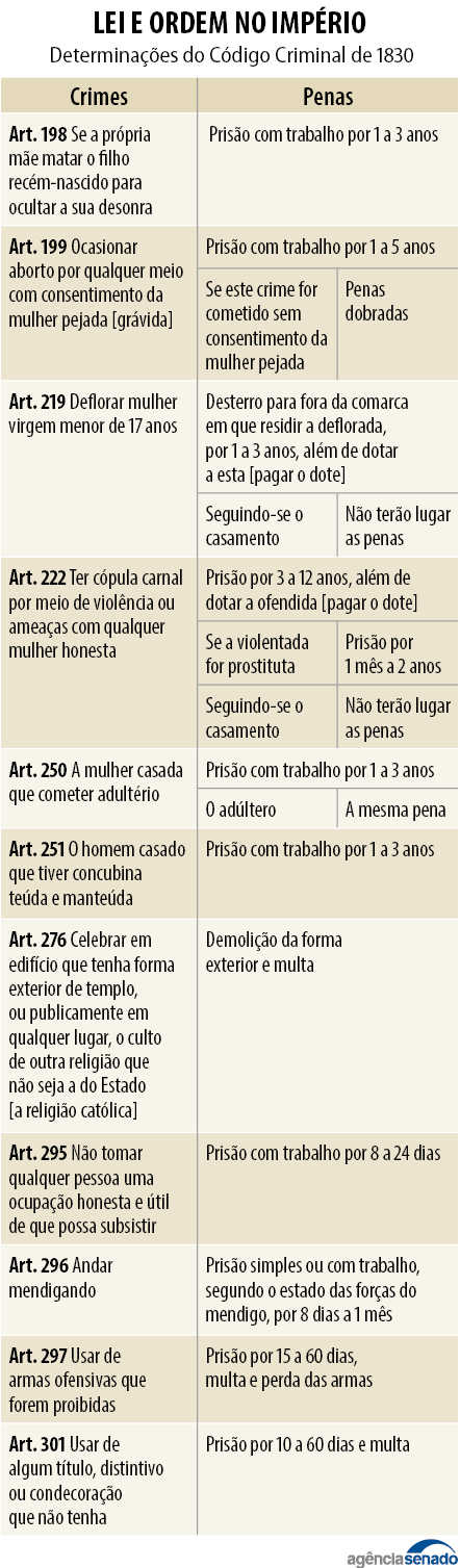 Não é que o Brasil do Primeiro Reinado fosse uma terra sem lei ou estivesse mergulhada no caos social antes da criação do Código Criminal. Apesar da ruptura com Portugal, uma série de leis lusitanas baixadas na época da Colônia (1500-1815) e do Reino Unido (1815-1822) continuaram valendo. Uma delas eram as Ordenações Filipinas, de 1603, que tinham uma parte dedicada exclusivamente às questões criminais.